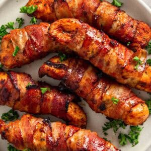 Easy and juicy bacon wrapped chicken tenders made in the air fryer or oven. A quick dinner or party snack with just a few simple ingredients!