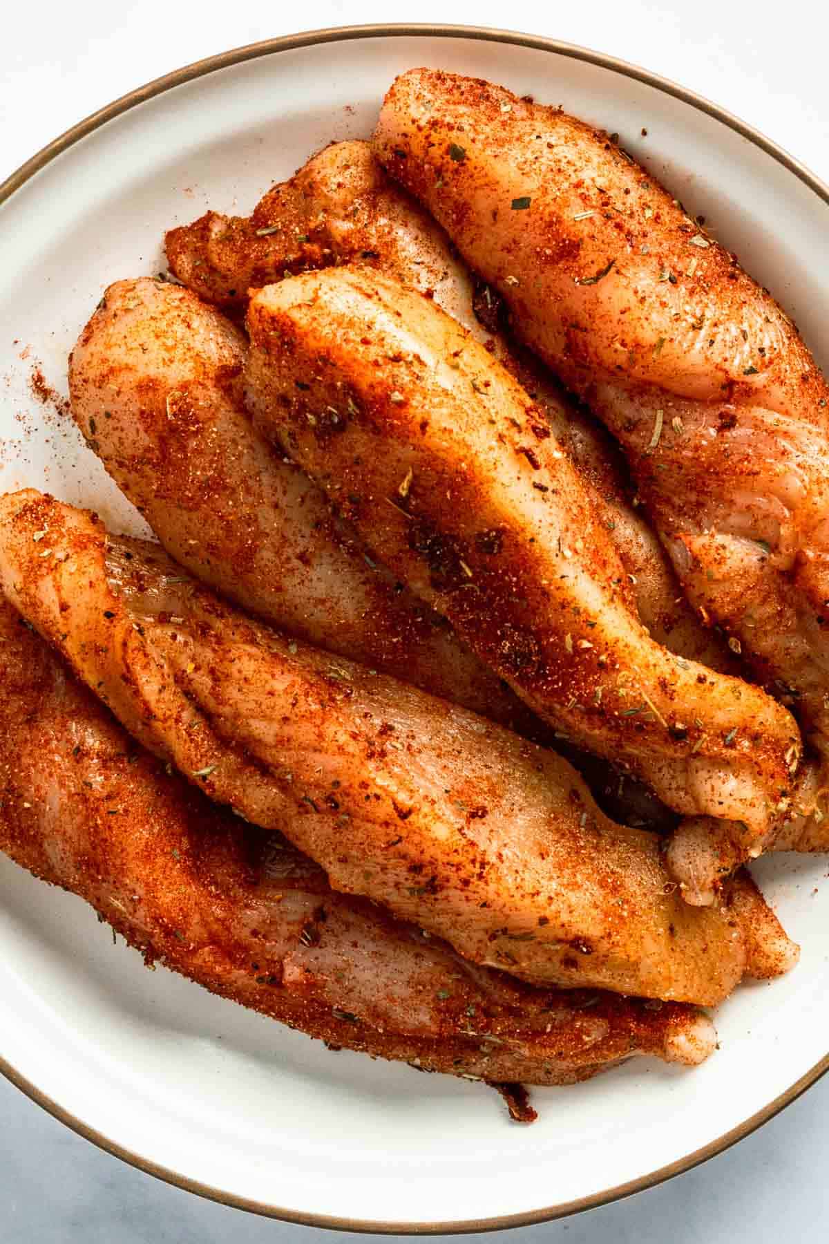 - Chicken breasts – I like using boneless, skinless chicken breasts sliced into tenders. You can swap in chicken tenderloins too if that’s what you have.