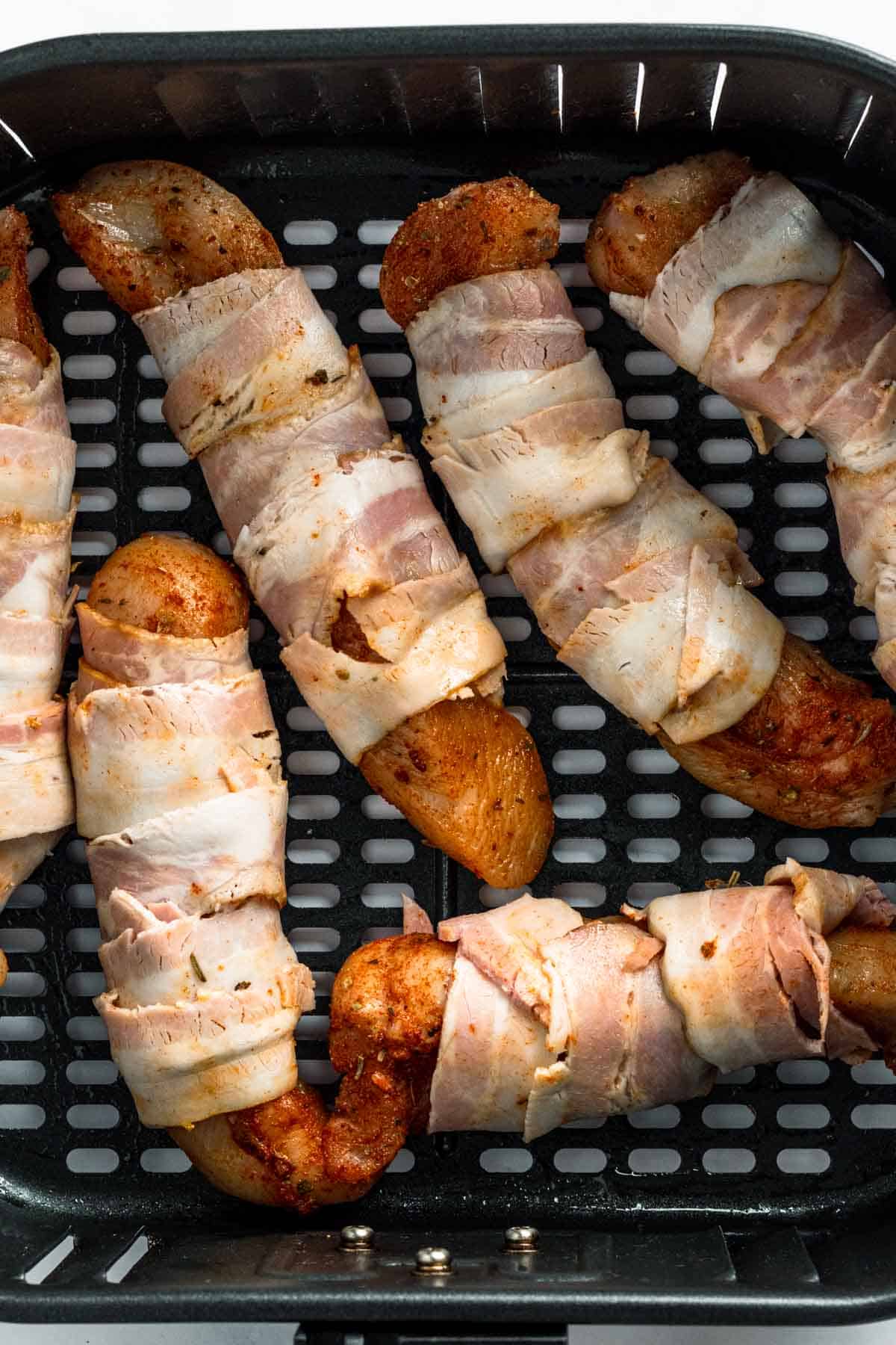 - Air fry: Preheat your air fryer to 400°F. Place the chicken in the basket and cook for 15–18 minutes until the bacon is crisp and the chicken hits 165°F.