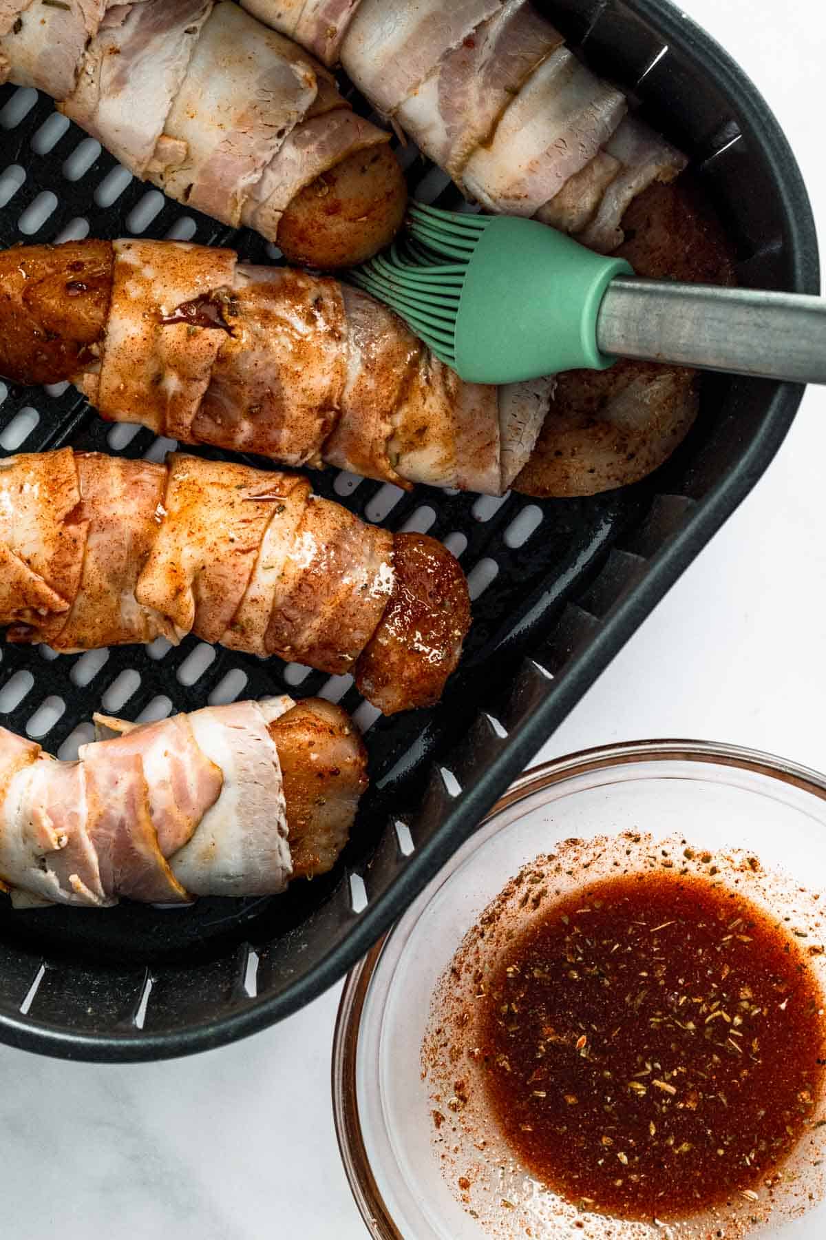 - Brush the glaze: Use a brush or spoon to coat the bacon-wrapped chicken with the sweet and smoky glaze.