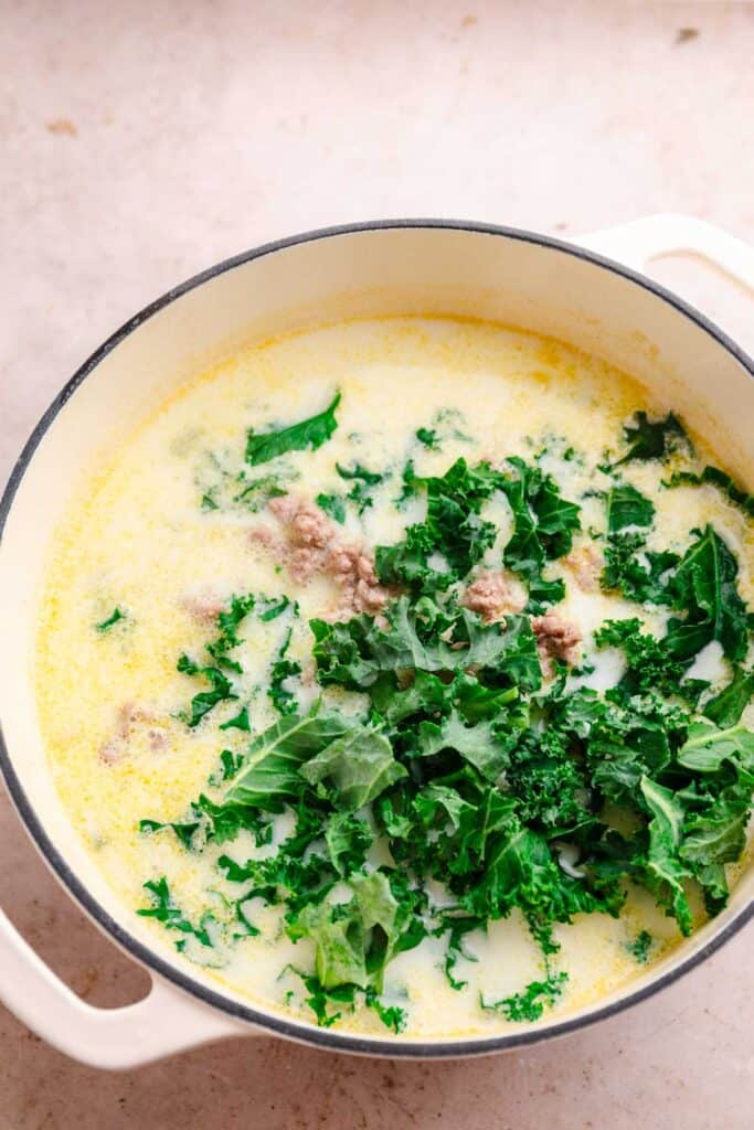 - Final adjustments: Taste and adjust the seasoning with more salt and pepper, if necessary. Add the cooked turkey sausage back into the pot, followed by the chopped kale. Let the soup simmer on low until the kale is wilted and tender.½ teaspoon salt or to taste, 4 cups kale