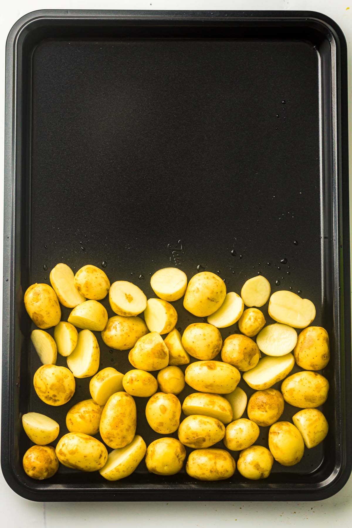 - Prep the potatoes: Toss the halved baby potatoes with olive oil, garlic powder, salt, and pepper. Spread on one-third of the sheet pan.1½ pounds baby potatoes, 2 tablespoons olive oil, 1 teaspoon garlic powder, 1 teaspoon Fine salt, ½ teaspoon Black pepper