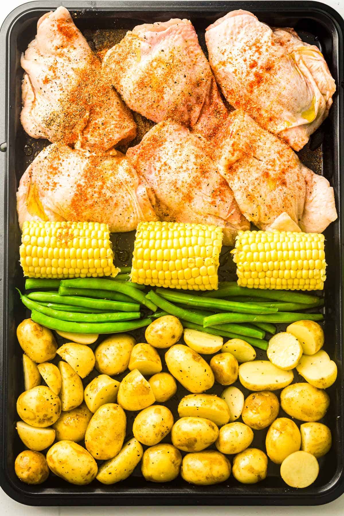 - Add the veggies: Arrange the green beans and corn on the other side of the pan. Drizzle with olive oil and season lightly with salt.