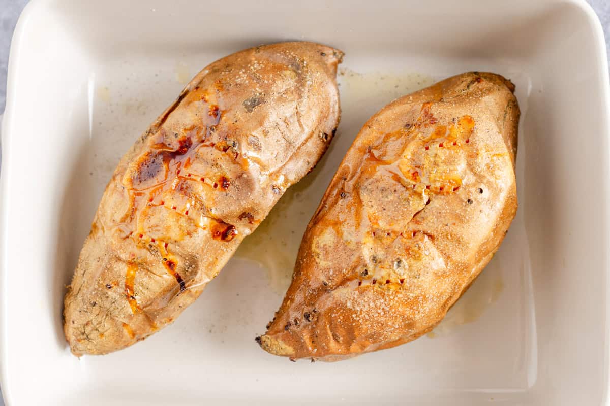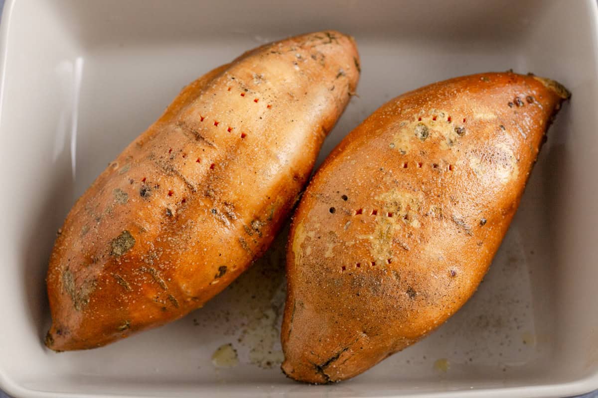 - Wash and dry the sweet potatoes: Scrub well to remove any dirt and pat dry completely.