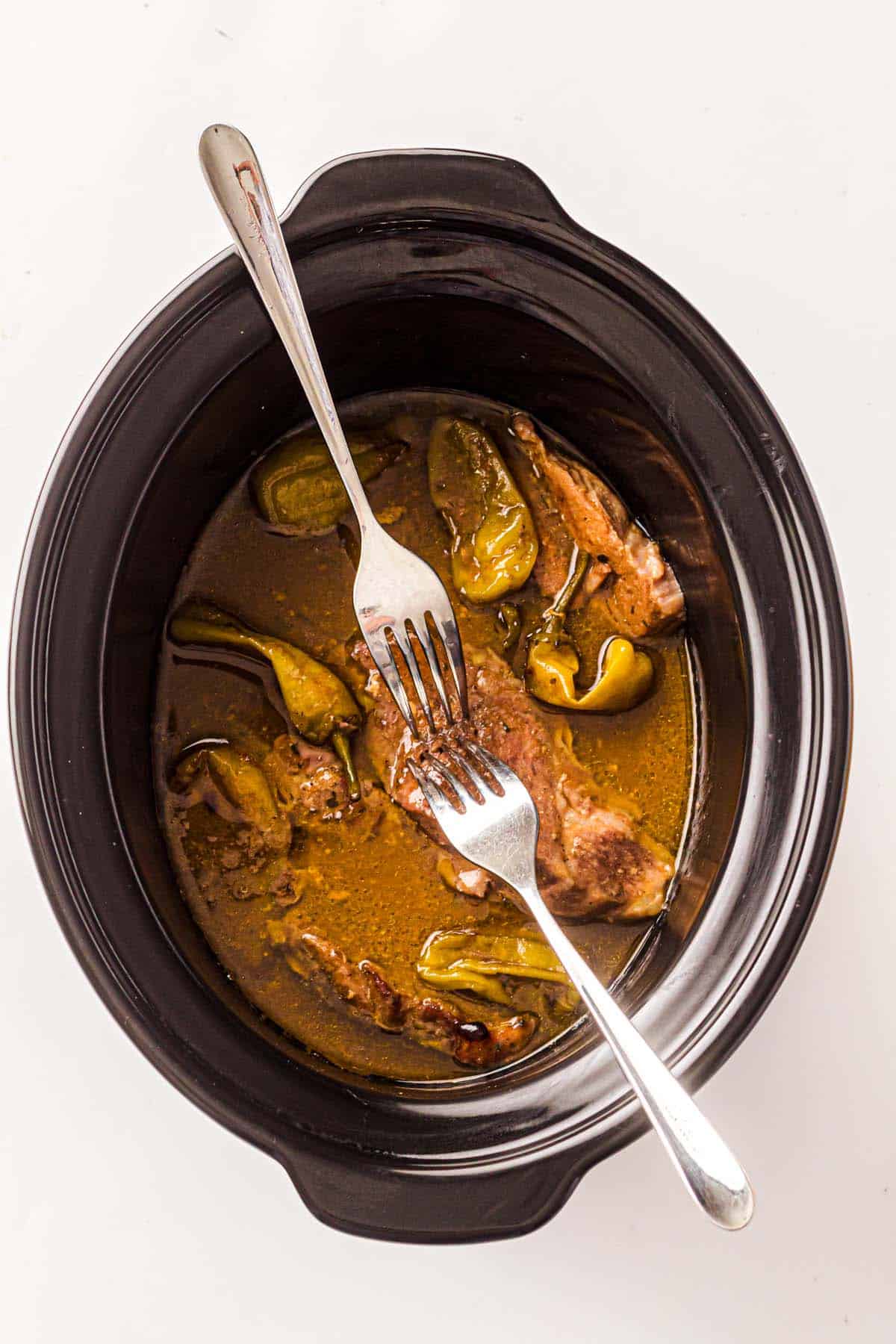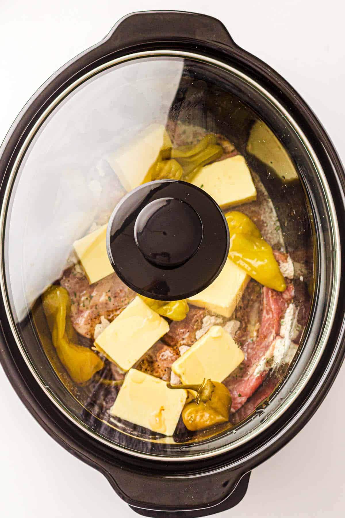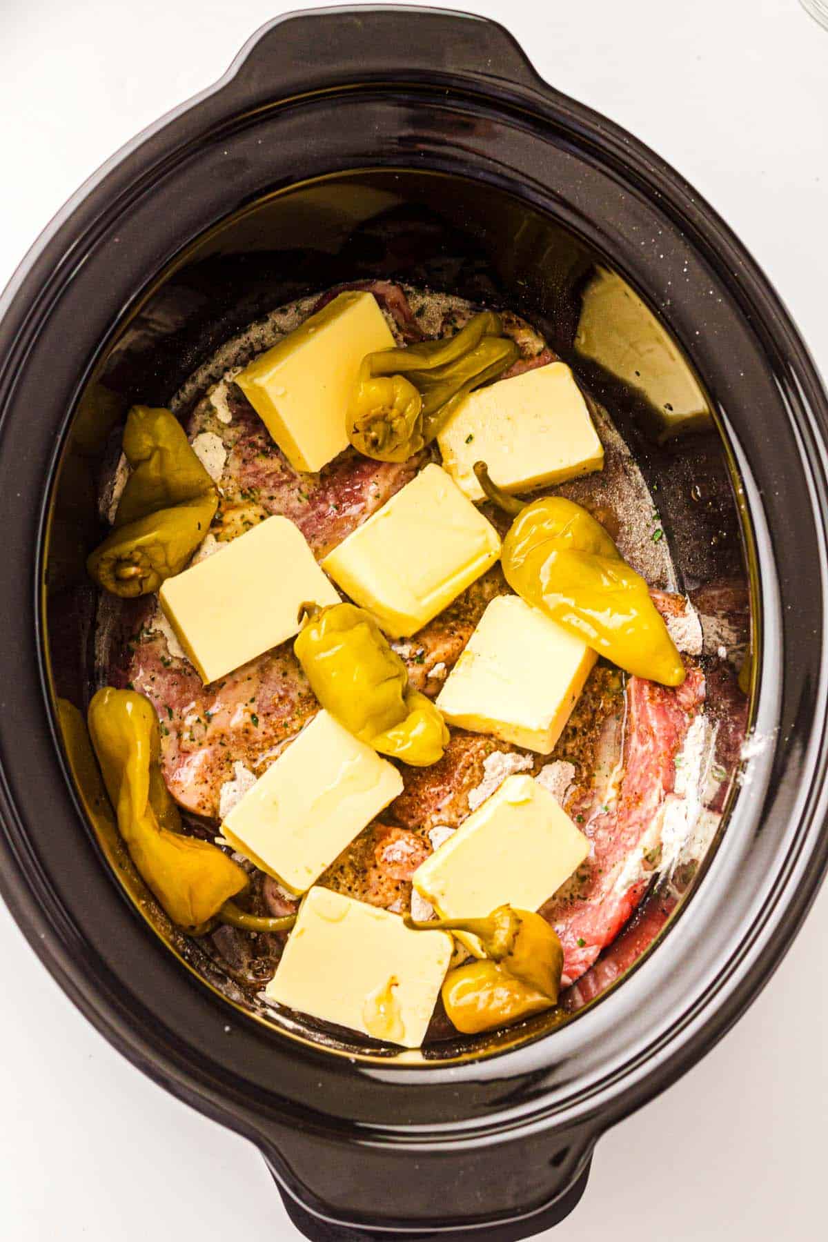 - Top with butter and peppers: Scatter the butter chunks over the pork, then add the pepperoncini on and around the roast. Pour in 2 tablespoons of the brine.½ cup unsalted butter, 6-8 pepperoncini peppers, ½ cup water or broth if your slow cooker runs hot