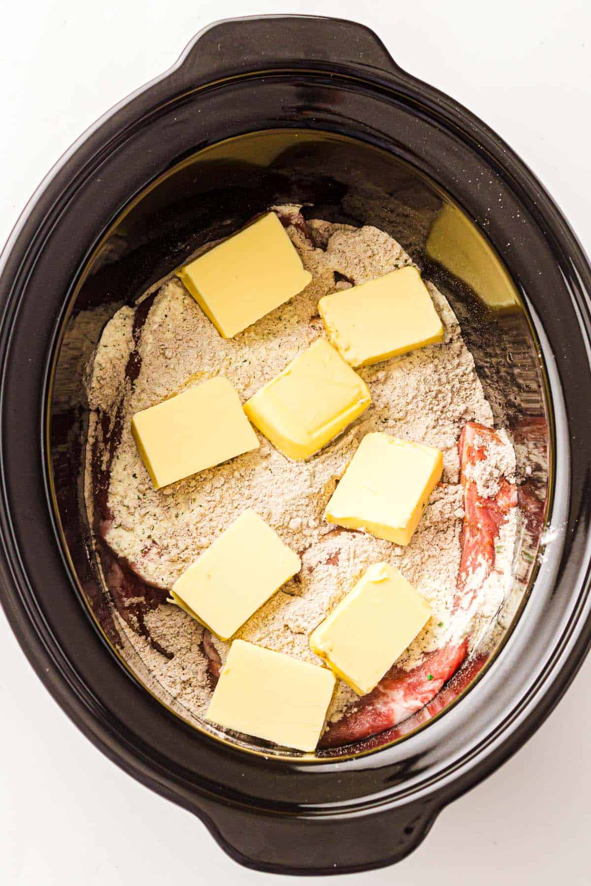 - Top with butter and peppers: Cut the butter into chunks and scatter them over the pork. Nestle the pepperoncini peppers around the roast, then pour in 2 tablespoons of the brine for tanginess.
