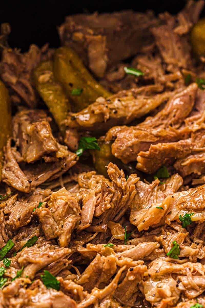 - Shred and mix: Remove a little of the excess liquid if needed, then shred the pork directly in the slow cooker. Stir everything together so the meat soaks up all the buttery, tangy juices.
